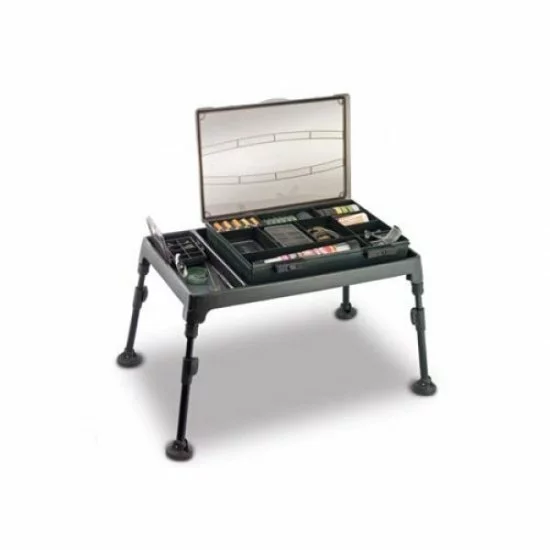 Fox Bivvy Table es una mesa fácil de usar para materiales que se usan con frecuencia y, por lo tanto, deben estar al alcance de la mano. Piense en una caja de aparejos, un teléfono móvil, las llaves del coche, una linterna, etc. La superficie de esta mesa está cubierta con un revestimiento antideslizante especial. Esto significa que, por ejemplo, se puede colocar con seguridad una taza de café caliente. Cada pata está equipada con pies giratorios, se puede plegar perfectamente y se puede asegurar con una abrazadera especial.